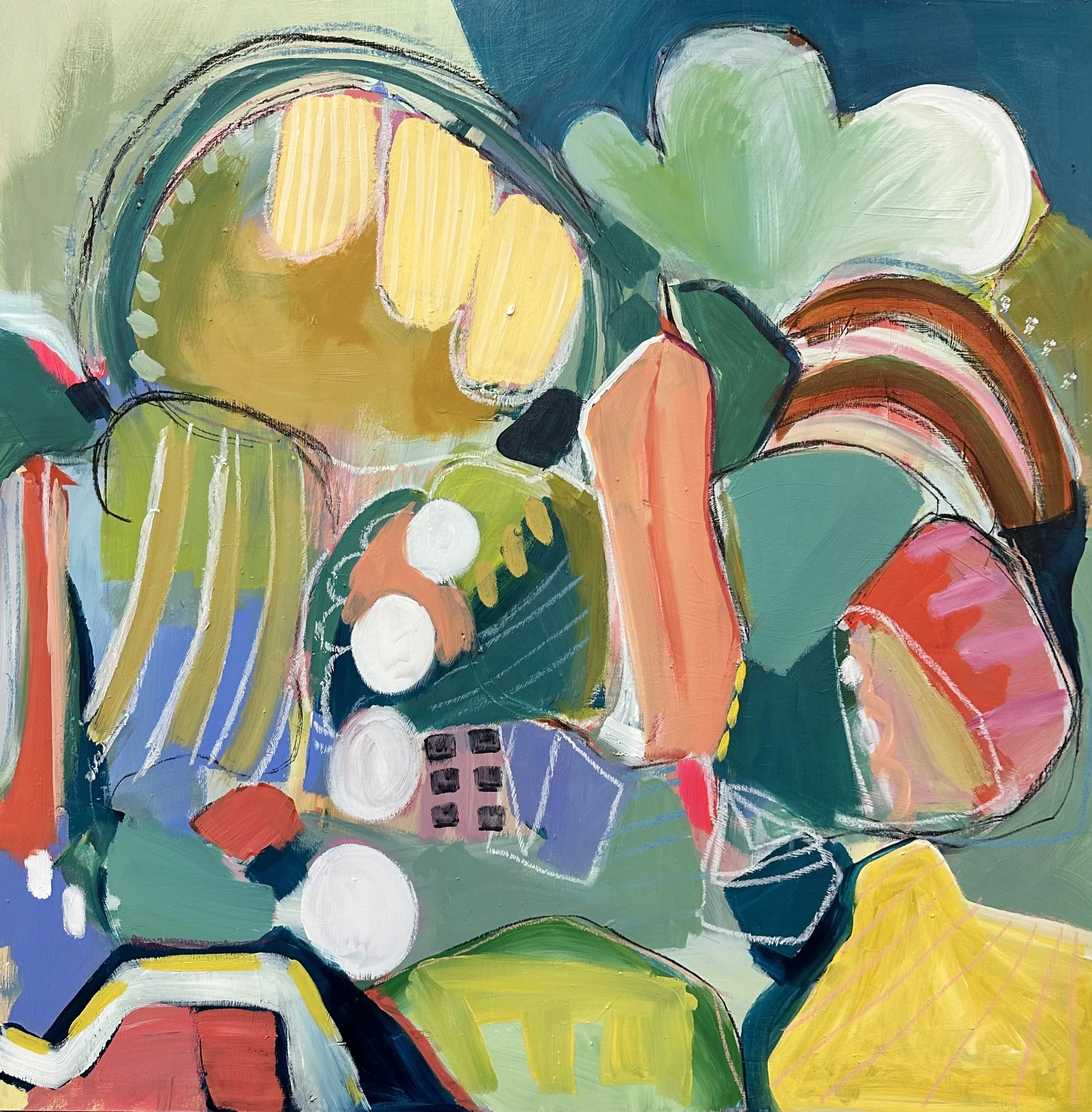 Kelly is primarily interested in landscape as a space and shapes as figures within that space—and using these elements as metaphors for life and emotions. Some of these abstract paintings include vessels. These paintings have a variety of bold and subtle shapes that take on personalities and emotions that show up and have conversations with each other while taking up a dynamic space. I love the idea of a conversation between shape, space, and color.